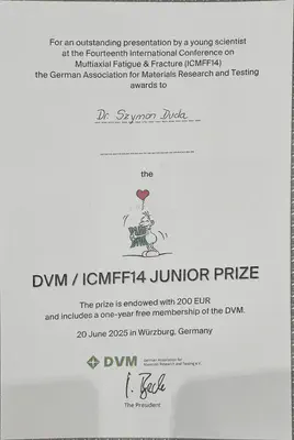 Podczas 14 Międzynarodowej Konferencji Wieloosiowe Zmęczenie i Pękanie (14th International Conference on Multiaxial Fatigue and Fracture) w Wurzburgu, organizowanej przez DVM, Szymon Duda został wyróżniony nagrodą dla młodego naukowca.